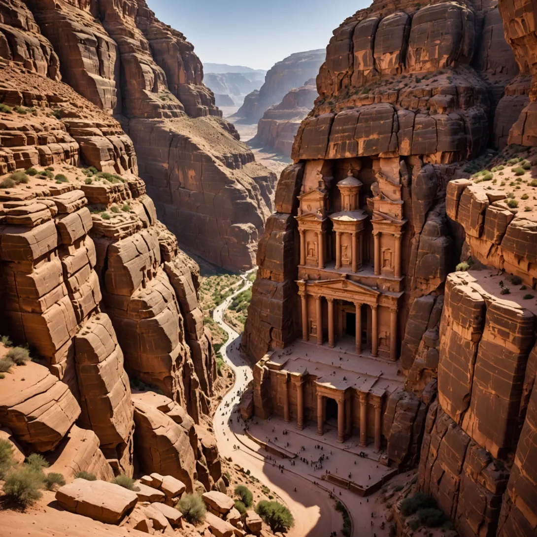- Siq-ul: Un defileu îngust de 1,2 kilometri care servește drept intrare principală în Petra. Pereții săi abrupți, care ajung până la 80 de metri înălțime, creează un efect dramatic înainte de a dezvălui Trezoreria.